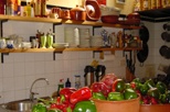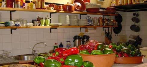 A agradável sala divide o mesmo espaço com a cozinha, antiga tasca. Se é verdade que todo o espaço convida ao descanso, não menos verdade é que este cantinho da casa é o mais castiço. Os utensílios de cozinha, todos expostos, decoram ao mesmo tempo que estão à mão, prontos para serem usados. Penduradas, por cima do balcão ficam as ervas, panelas e os tradicionais canecos de barro. Tudo muito típico.