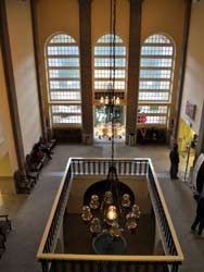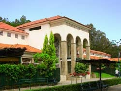 Para lá dos grandes arcos que denunciam a arquitectura Estado Novo do edifício, abre-se uma sala ampla e de tectos altos que nos transporta de imediato para os anos dourados do termalismo português, com todo o fausto e charme da primeira metade do século passado.